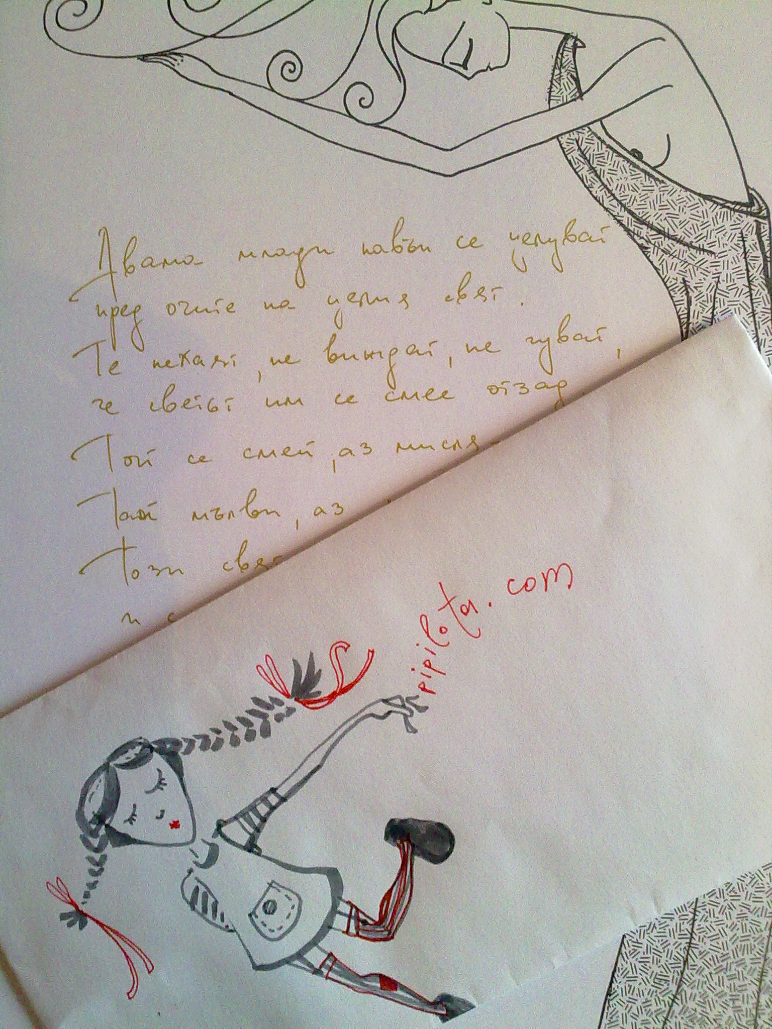 Наблюдавах Pippilota докато рисуваше пликове за истински, хартиени писма на хората (сами виждате какво я помолих да нарисува на моя плик ).