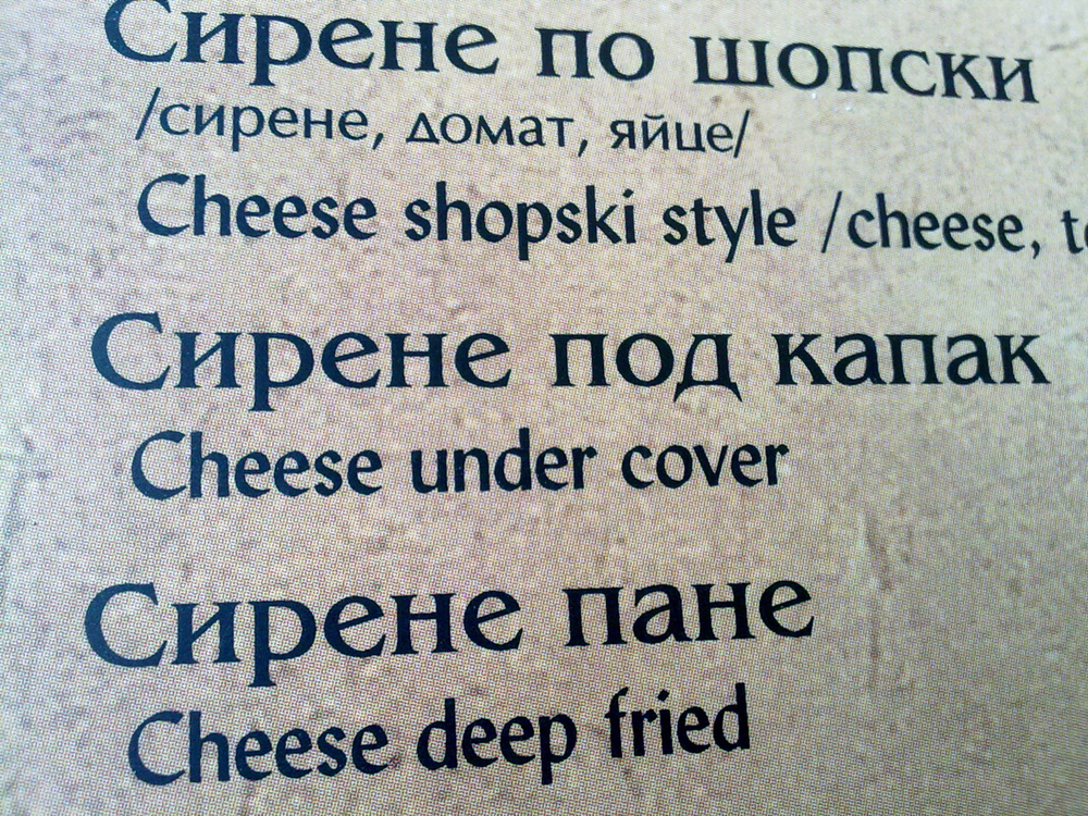 Тук виждаме един шедьовър на преводаческото изкуство „сирене под прикритие“ или направо „сирене по шпионски а ла 007“ (подобно на „стисканото мляко“, видяно в същото меню)